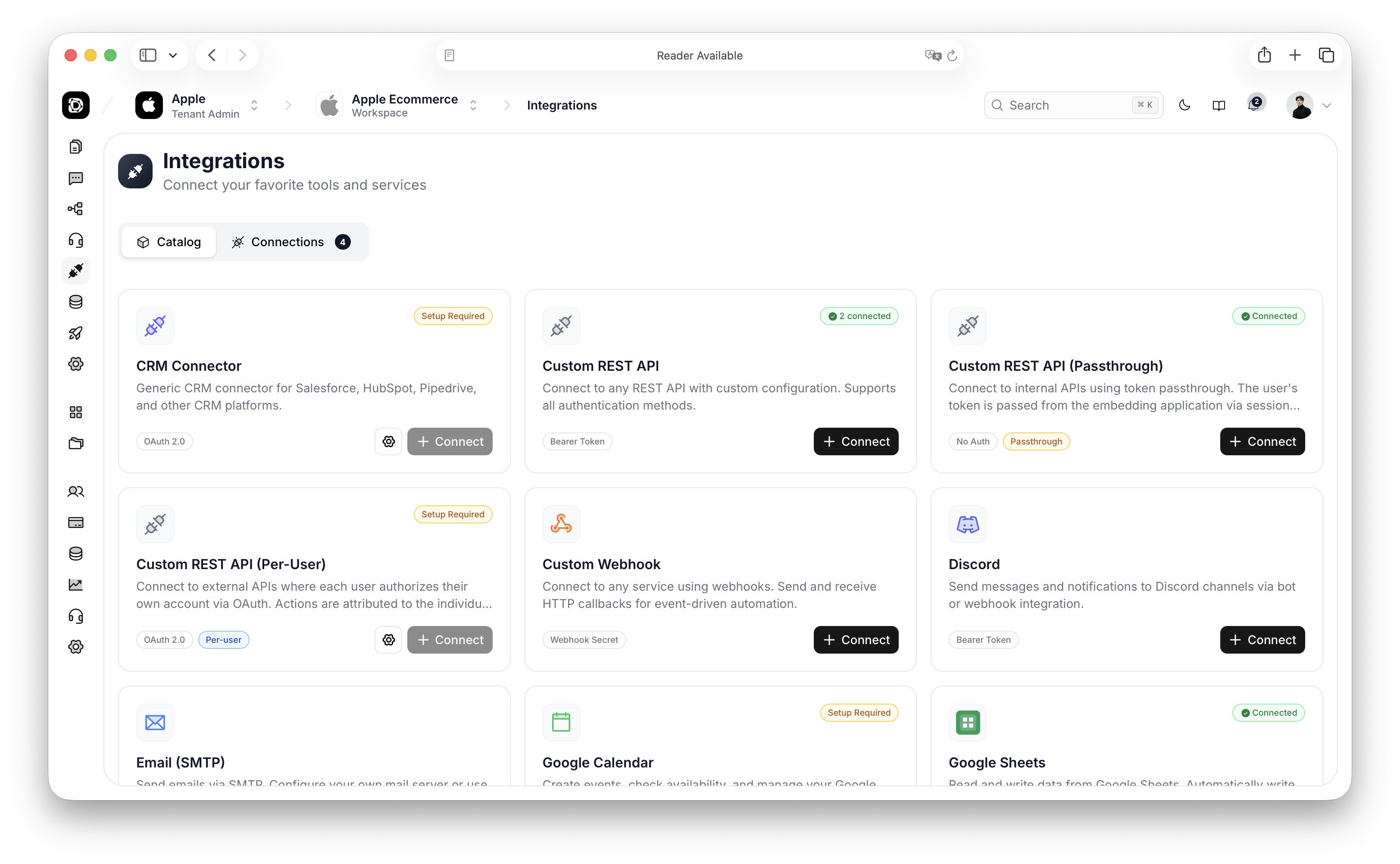 Configurable API connectors, OAuth/API key authentication, webhooks, and custom tool execution that allow AI agents to interact with CRM, ERP, messaging platforms, and other third-party services.