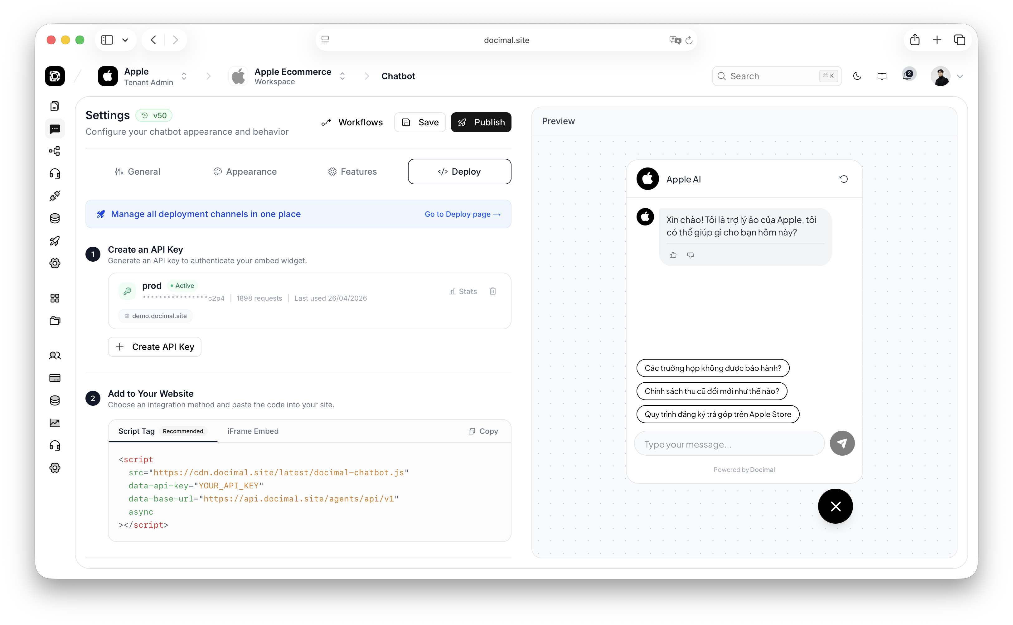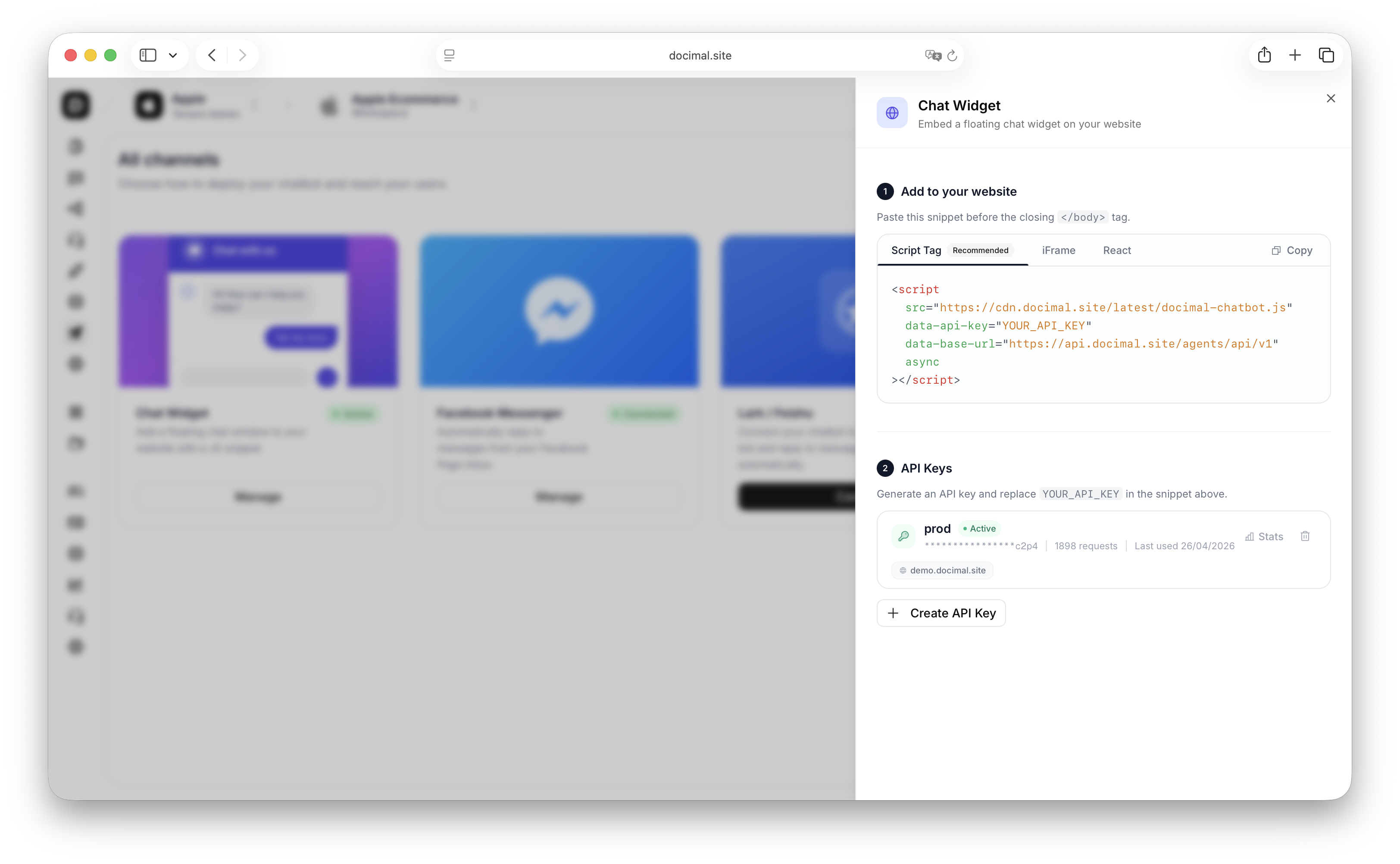 Lightweight chatbot integration through iframe, JavaScript SDK, or React component, allowing businesses to embed AI assistants directly into websites and applications.
