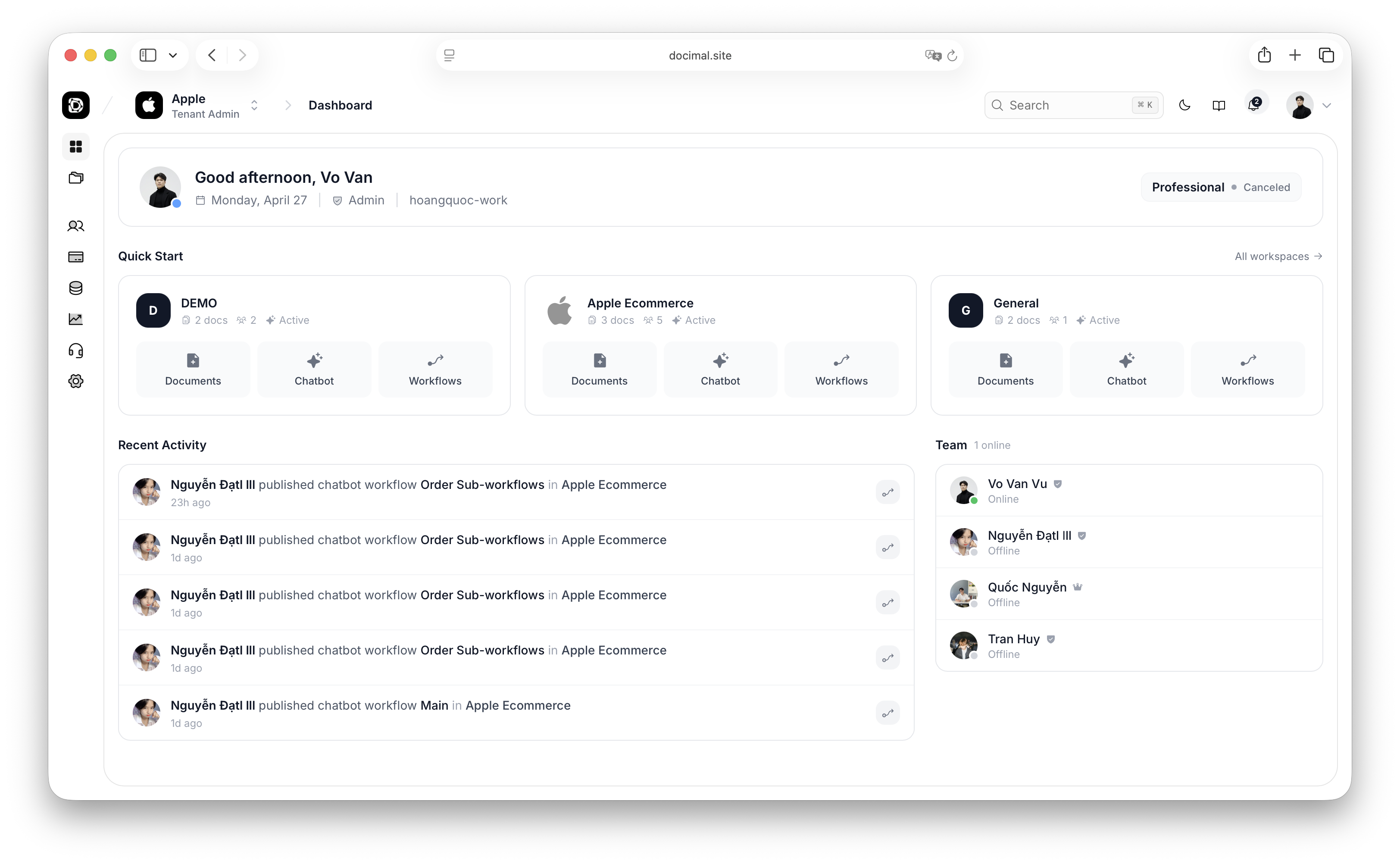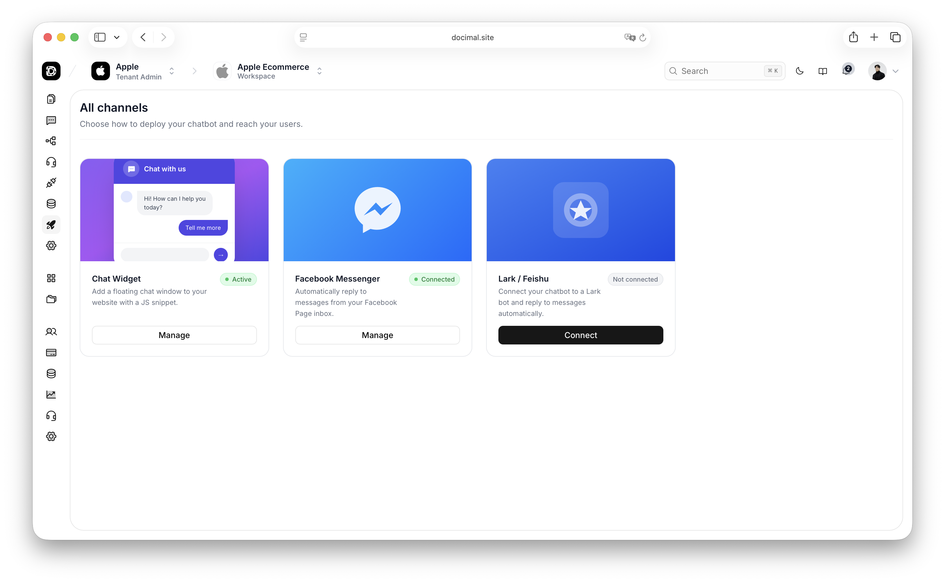 Docimal AI is a multi-tenant AI Agent Chatbot & Automation Platform that helps businesses build intelligent assistants capable of answering questions from internal knowledge bases, automating workflows, filling forms, generating documents, and integrating with external APIs.