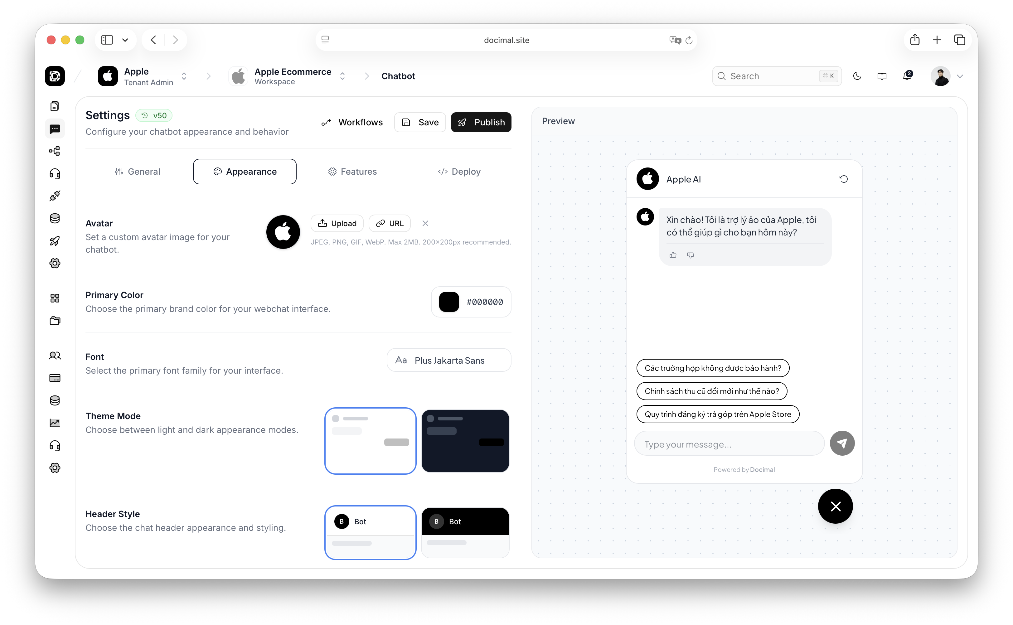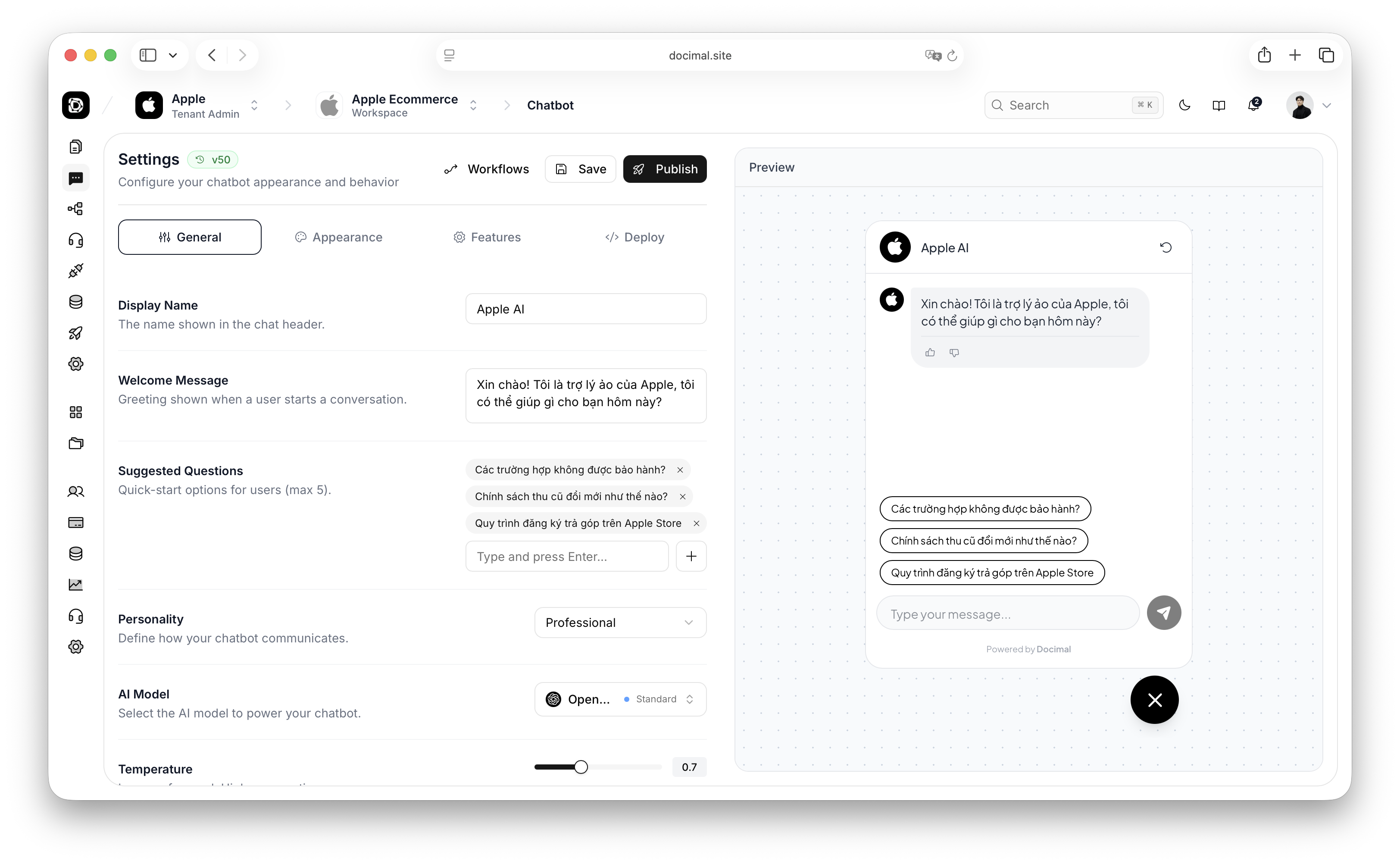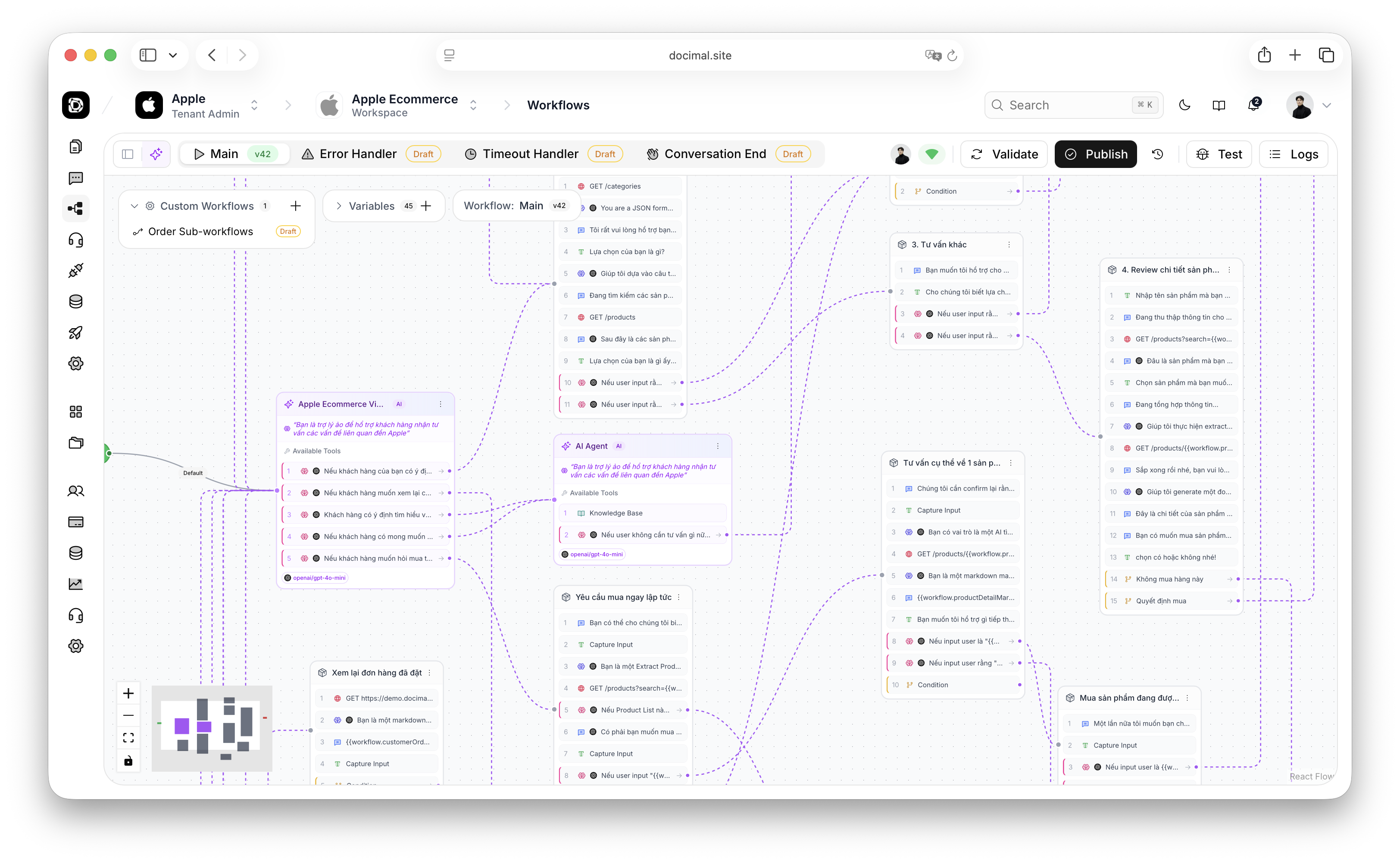 Customizable chatbot agents that can answer questions, use internal knowledge bases, call tools, connect to external APIs, and support multilingual conversations in English and Vietnamese.