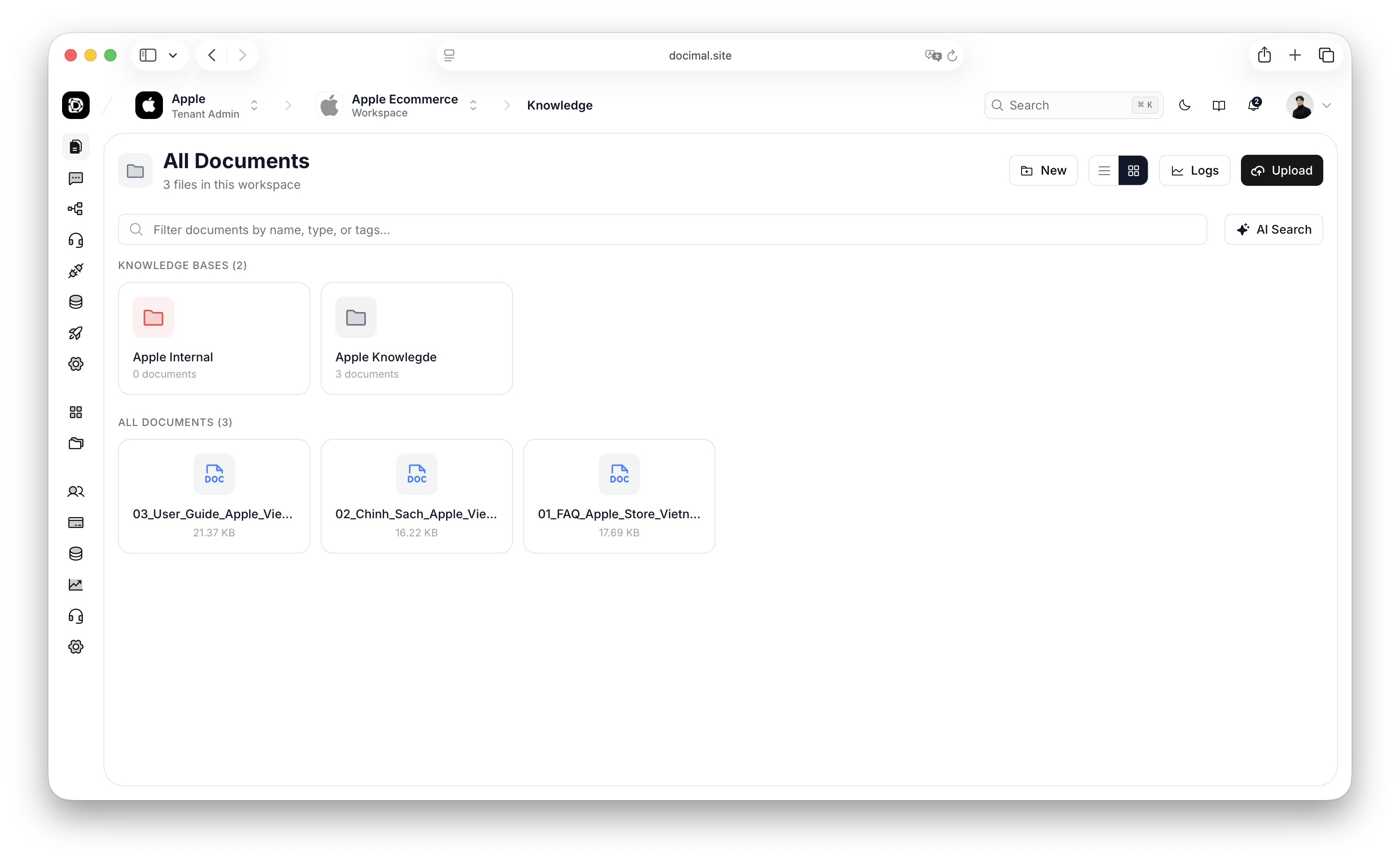 Developed Docimal AI — a multi-tenant AI Agent Chatbot & Automation Platform that enables businesses to build intelligent conversational assistants for internal knowledge search, workflow automation, form filling, document generation, and third-party API integration. The platform combines RAG-powered knowledge retrieval, customizable AI agents, embeddable chatbot widgets, workflow builders, and enterprise-grade user/organization management to help teams turn conversations into real business actions. Docimal supports document ingestion from multiple file formats, source-grounded answers, real-time chat experiences, external API connectors, and deployment through web apps, iframe widgets, or JavaScript SDK.